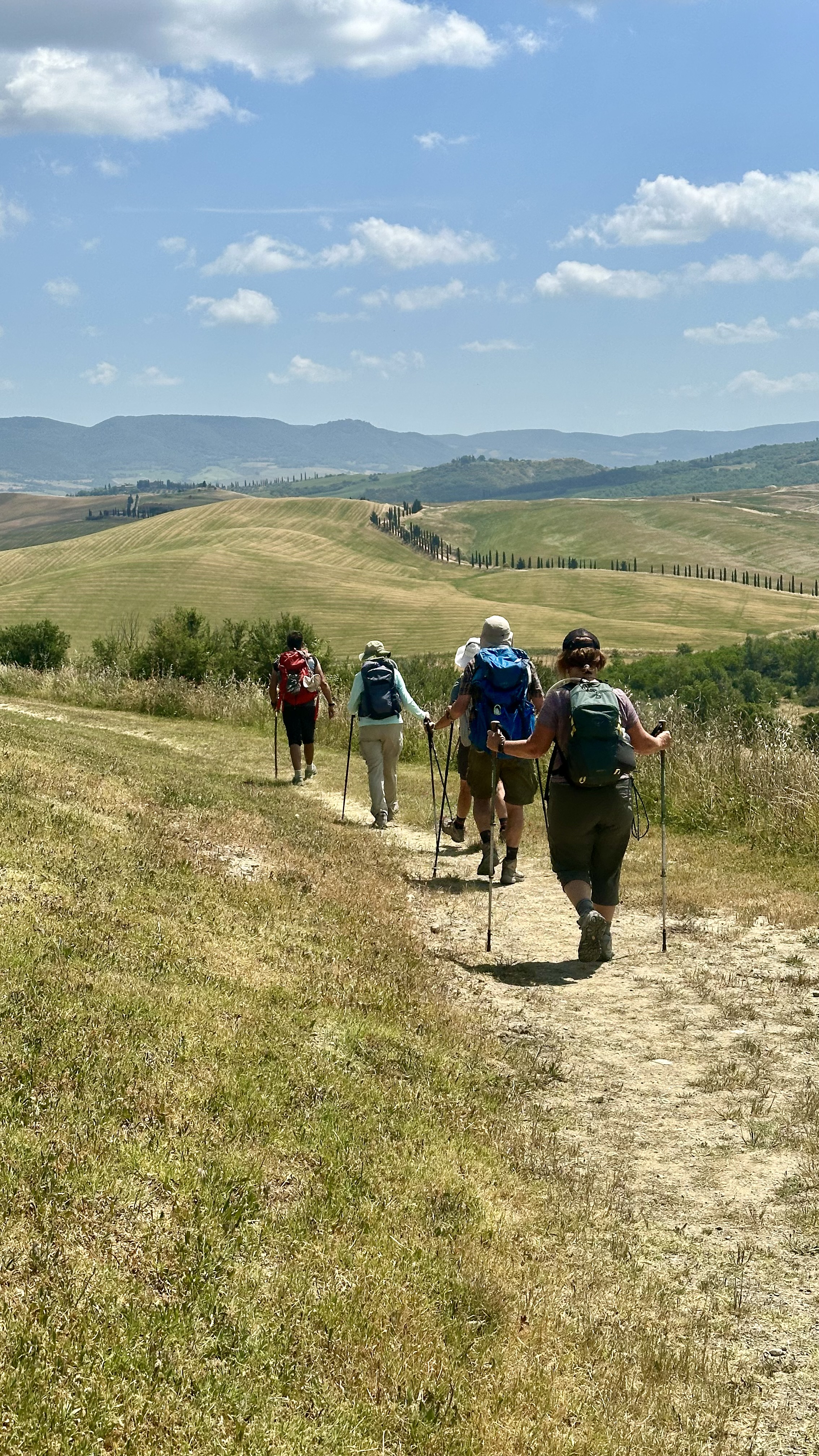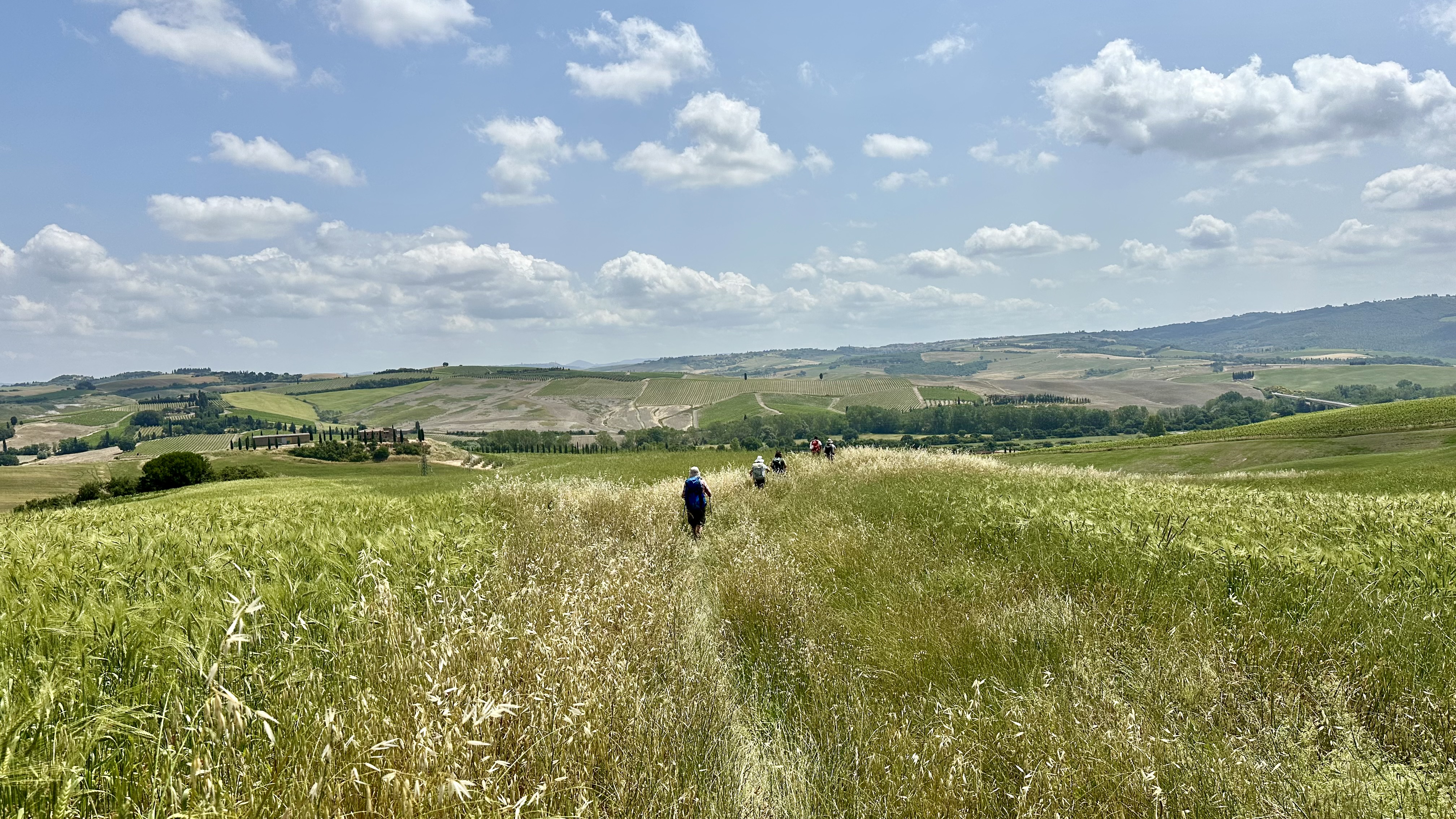 Undulating tracks cross the Crete Senesi—clay hillscapes, lone farmhouses, and wide horizons. Expect field paths, white roads, and village stops for water and coffee. Finish by the Ombrone plain at Ponte d’Arbia, with a simple pilgrim welcome and a well-earned meal.